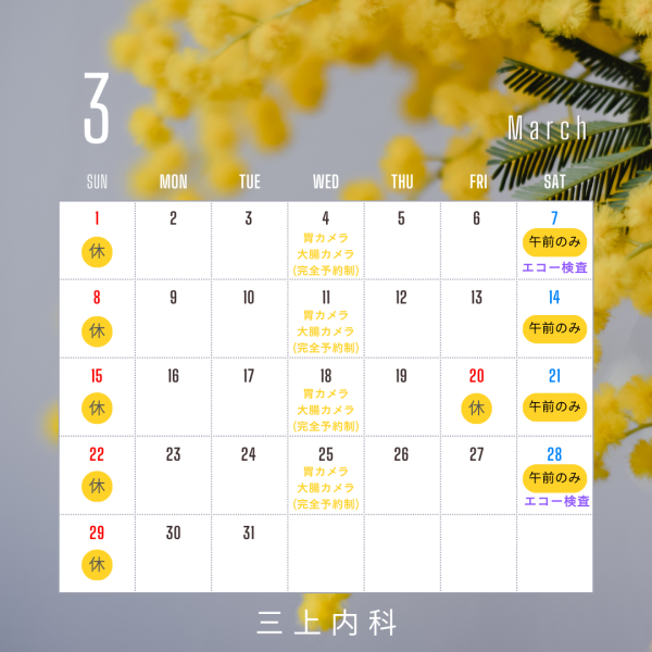 3月は定休日以外の休診日はありません(休診日についてはカレンダーをご参照ください)。
