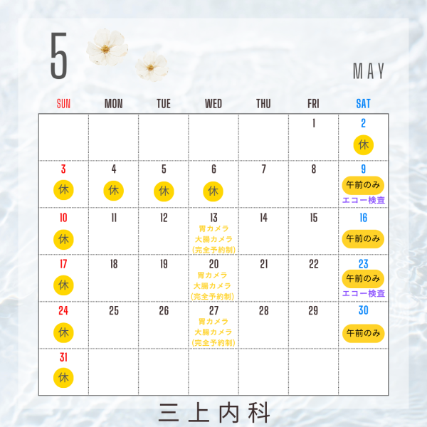 5月は定休日以外の休診日はありません(休診日についてはカレンダーをご参照ください)。