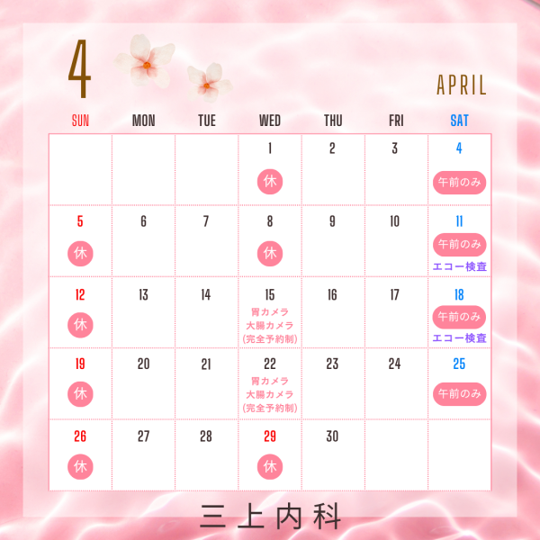 4月は定休日以外の休診日はありません(休診日についてはカレンダーをご参照ください)。